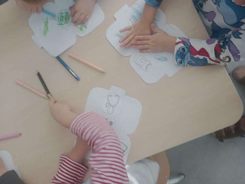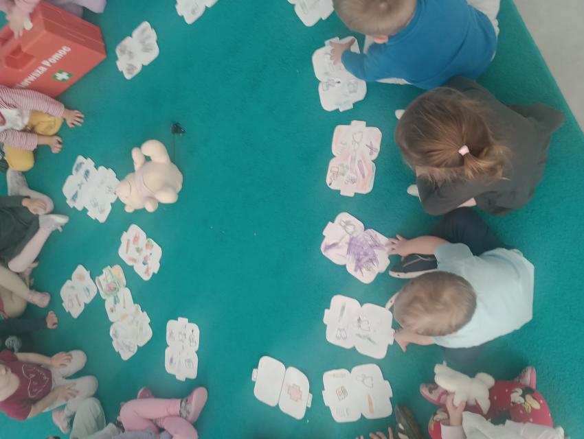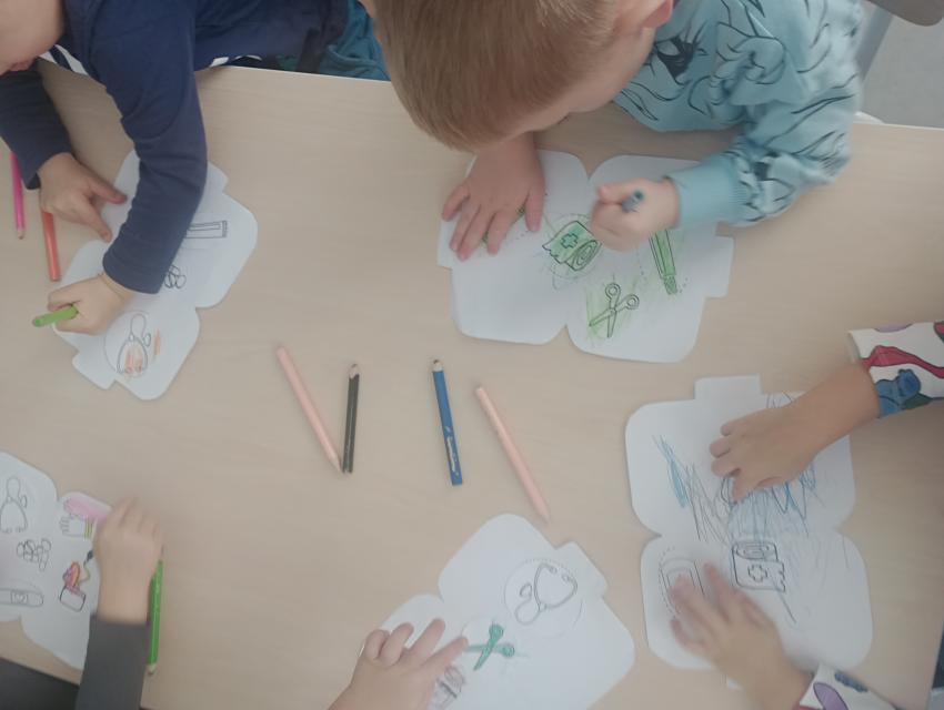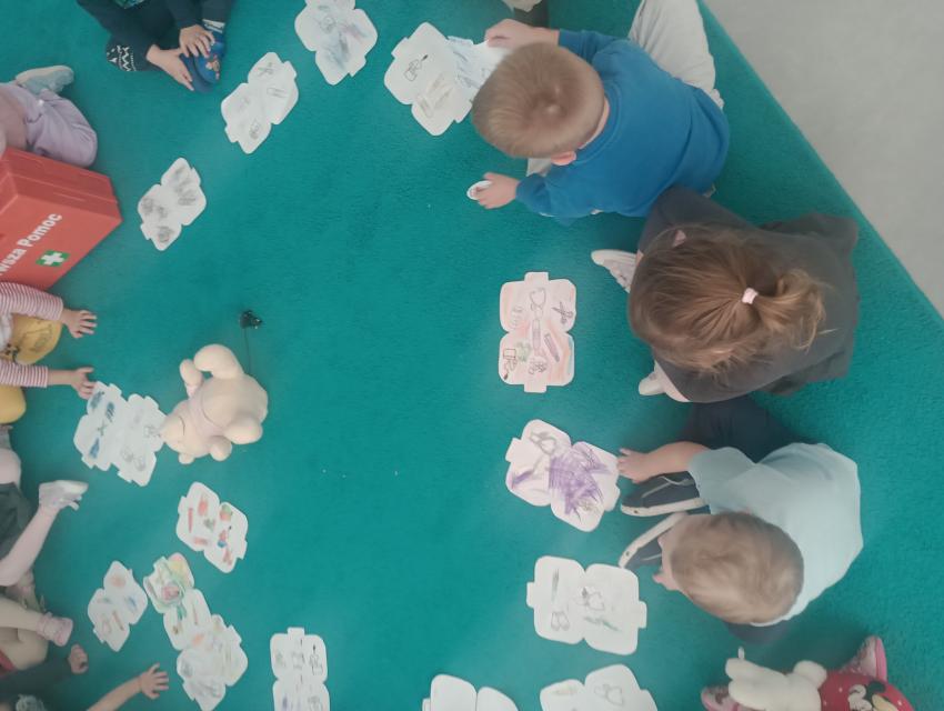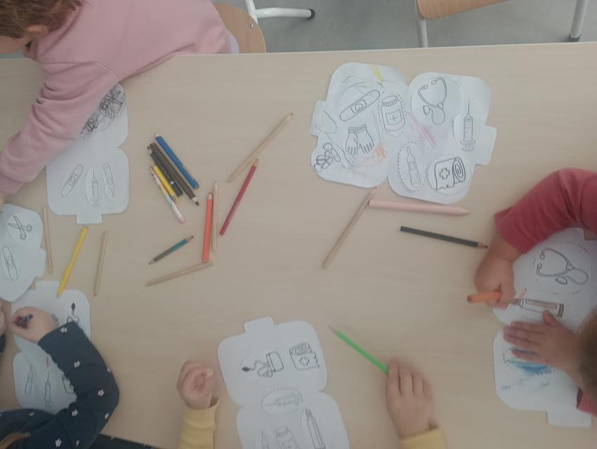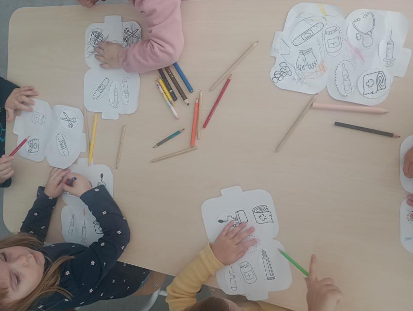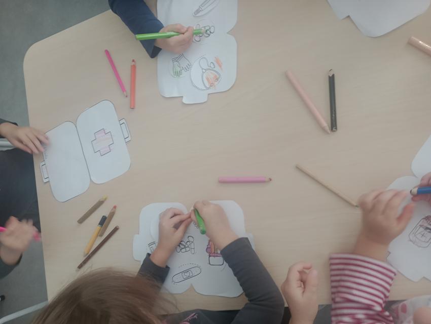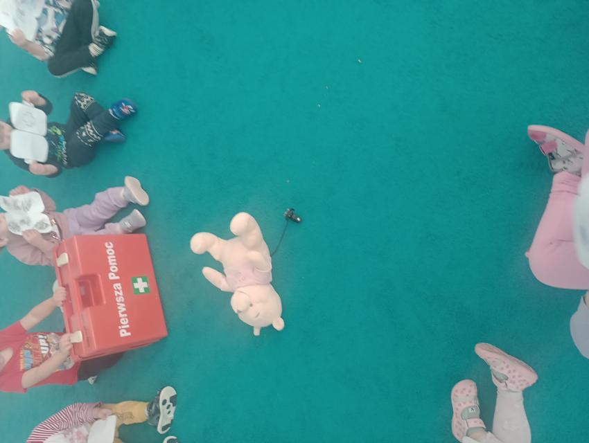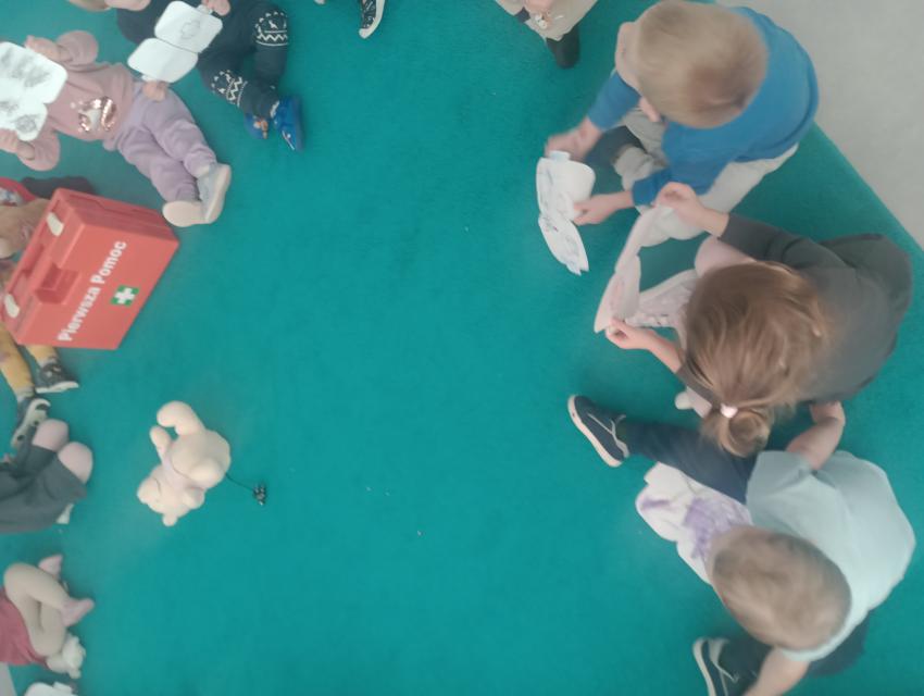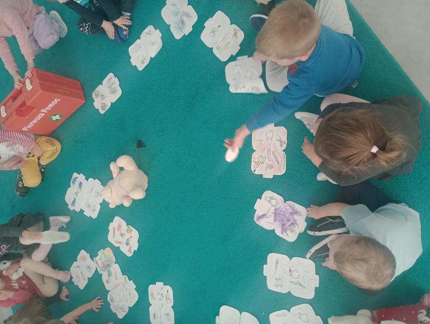 W ramach realizacji projektu - Bezpiecznie i zdrowo z Małpką Iwonką, grupa Koniczynek poznała zasady udzielania pierwszej pomocy. Przedszkolaki uczyły się jak wezwać pomoc, poznawały zawartość apteczki a także ćwiczyły opatrywanie ran. Kolejnym punktem było tworzenie własnej apteczki. Koniczynki umieszczały w apteczce przedmioty , które powinny się w niej znaleźć . Dzieci utrwaliły numer alarmowy 112 pięknie kolorując kolorowanki z Małpką Iwonką.
