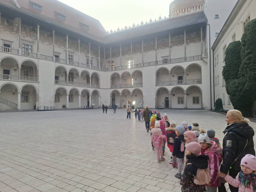 Dnia 13 listopada dzieci z grup Biedronek i Pszczółek miały wyjątkową okazję odwiedzić Zamek Królewski, gdzie mogły wysłuchać fascynujących legend wawelskich oraz podziwiać majestatyczne komnaty królewskie. Zarówno bogato zdobione wnętrza, jak i opowiedziane historie zrobiły ogromne wrażenie na młodych uczestnikach wycieczki. Dzięki tej podróży w czasie dzieci mogły na chwilę przenieść się do przeszłości i poczuć atmosferę dawnych wieków, poznając bogactwo polskiej kultury i historii. To była niezapomniana lekcja historii, która na długo pozostanie w ich pamięci.