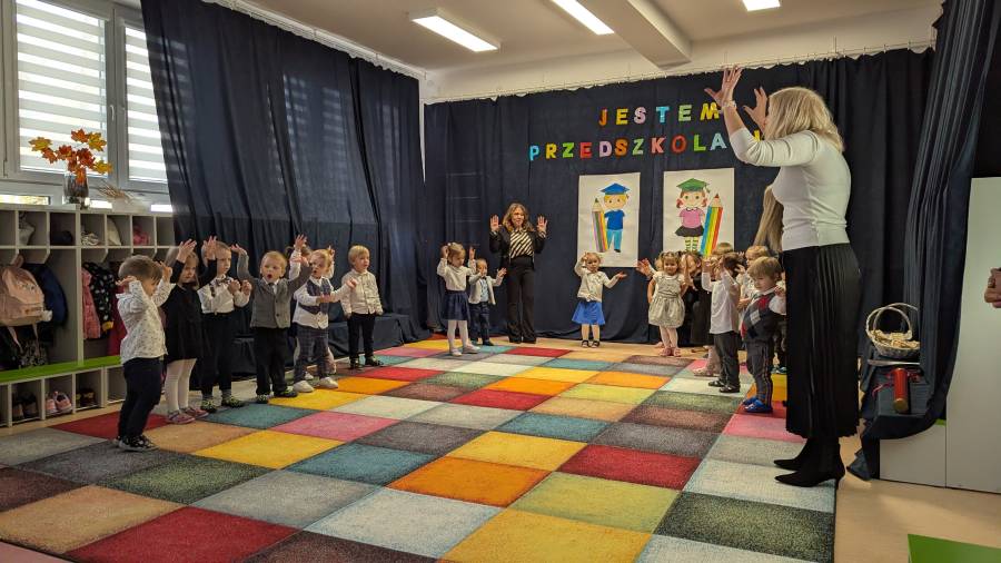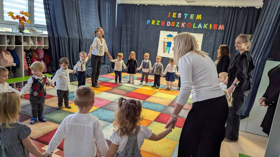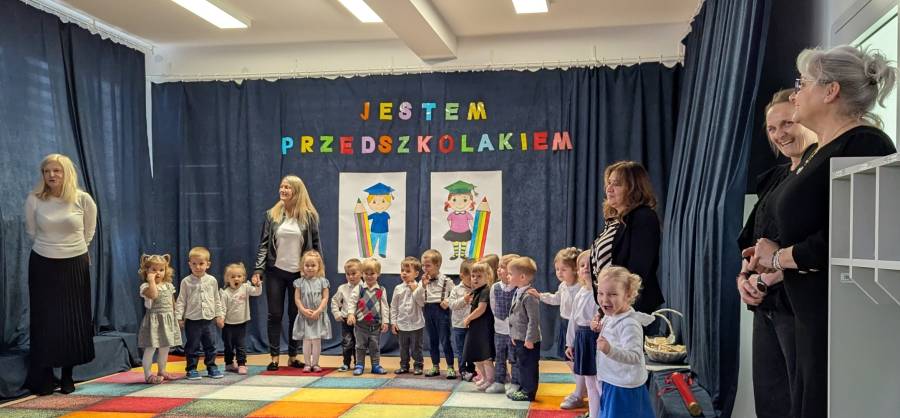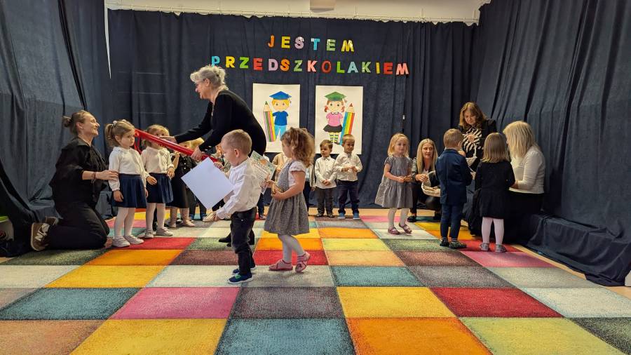 Pasowanie na przedszkolaka to wyjątkowa uroczystość, która w naszym stokrotkowym przedszkolu odbyła się 14 listopada. Od samego rana trwały przygotowania, próby, a tuż przed rozpoczęciem w dużym holu - gromadzili się goście - rodzice i członkowie rodziny. Uroczystość rozpoczęły występy dzieci z grupy Koniczynek. Nasi artyści zaprezentowali przygotowane piękne piosenki, tańce pod okiem naszych kochanych Pań. Dla większości był to pierwszy, bardzo ważny występ w ich życiu. Po części artystycznej nastąpił akt pasowania, czyli dotknięcie ramienia każdego przedszkolaka ogromną kredką przez Panią Dyrektor Iwonę Duran. Dla przedszkolaków było to wielkie przeżycie, a dla rodziców powód do dumy i zadowolenia ze swoich pociech. Potem dzieci wraz Rodzicami udali się na krótkie warsztaty, gdzie wspólnie wykonali pamiątkowe koszulki. Śmiechu i zabawy było co nie miara !