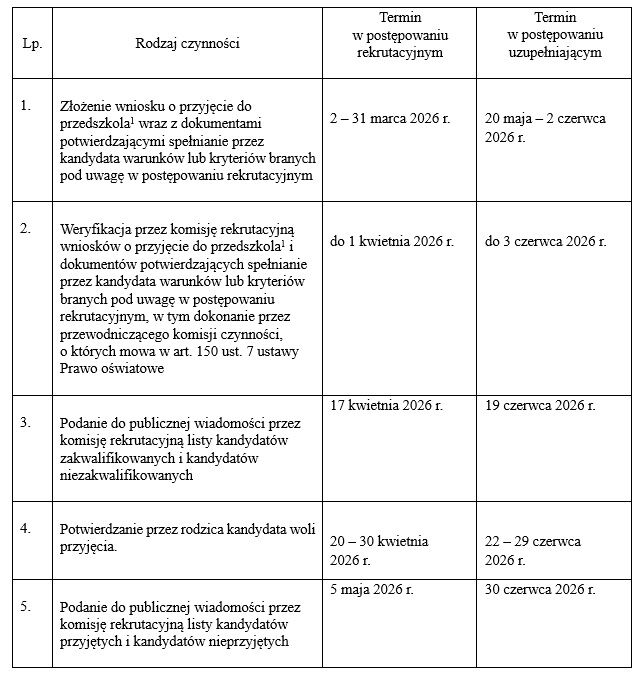 Dzieci kontynuujące wychowanie przedszkolne w dotychczasowym przedszkolu/oddziale przedszkolnym w szkole nie biorą udziału w rekrutacji – rodzice składają jedynie w terminie 7 dni poprzedzających termin rozpoczęcia postępowania rekrutacyjnego (tj. 19-27 lutego 2026 r.) Deklarację o kontynuowaniu wychowania przedszkolnego.