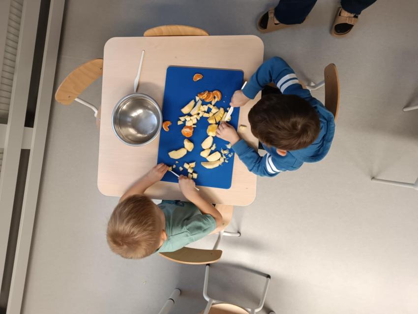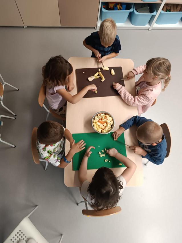 Zabawa była nie tylko pyszną przygodą, ale też doskonałą okazją do rozmowy o zdrowym odżywianiu oraz rozwijania sprawności manualnej i wrażliwości sensorycznej.