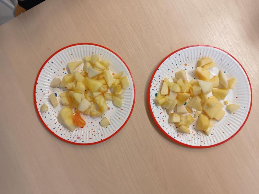 Podczas zajęć przedszkolaki rozpoznawały owoce po zapachu i kształcie, porównywały ich kolory i faktury, a następnie samodzielnie przygotowywały zdrowe przekąski.